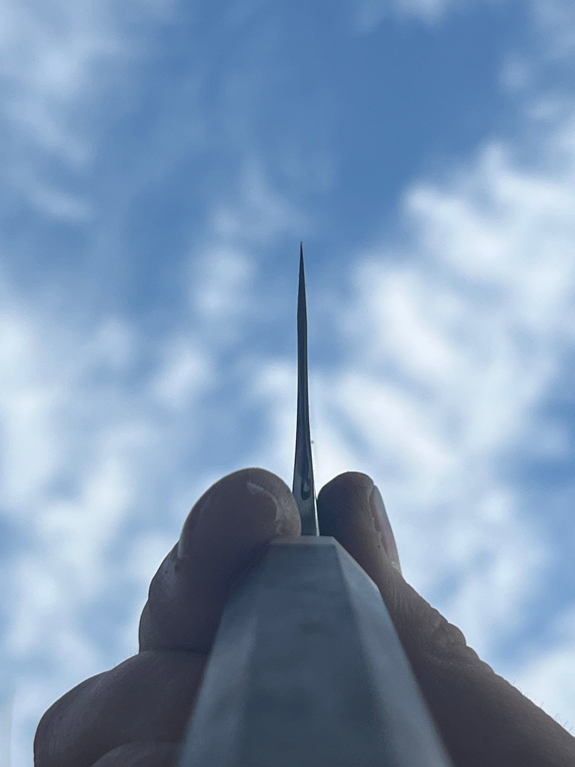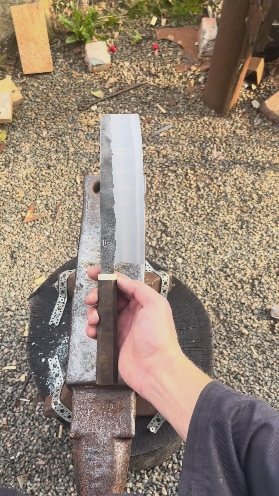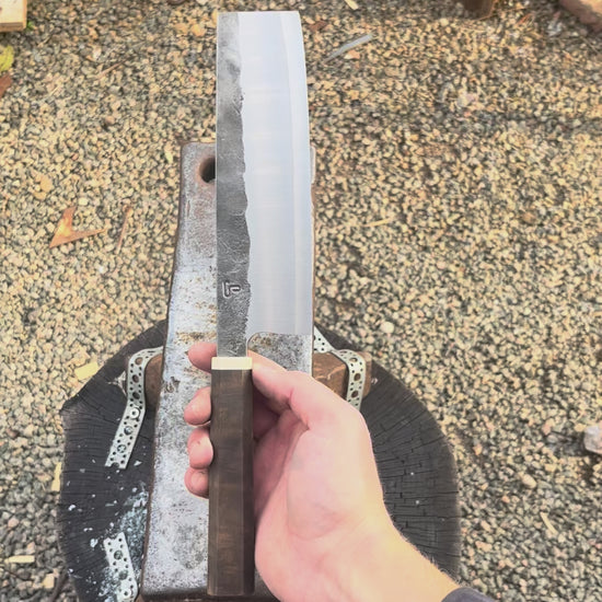 A hand forged nakiri knife with an S-grind.