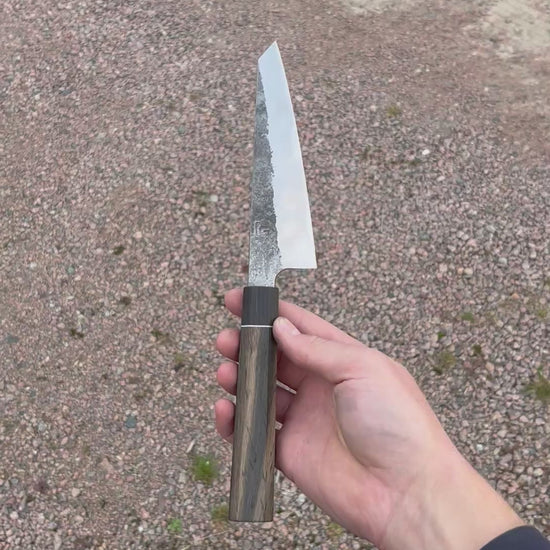 A japanese style honesuki knife hand forged from 80CrV2 high carbon steel. The handle is made from bog oak and ebony. The knife has a convex bevel and a distal taper throughout the blade.